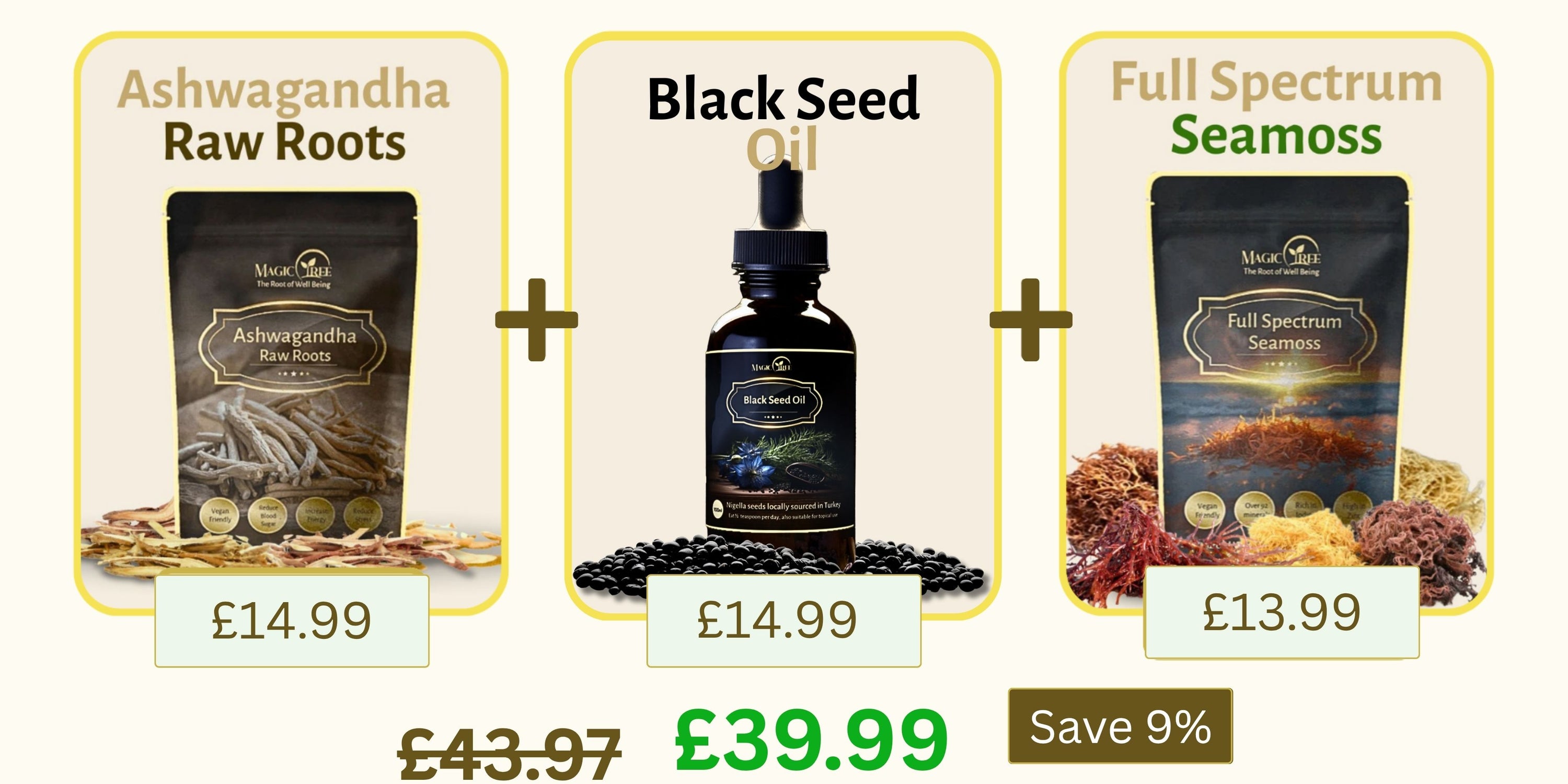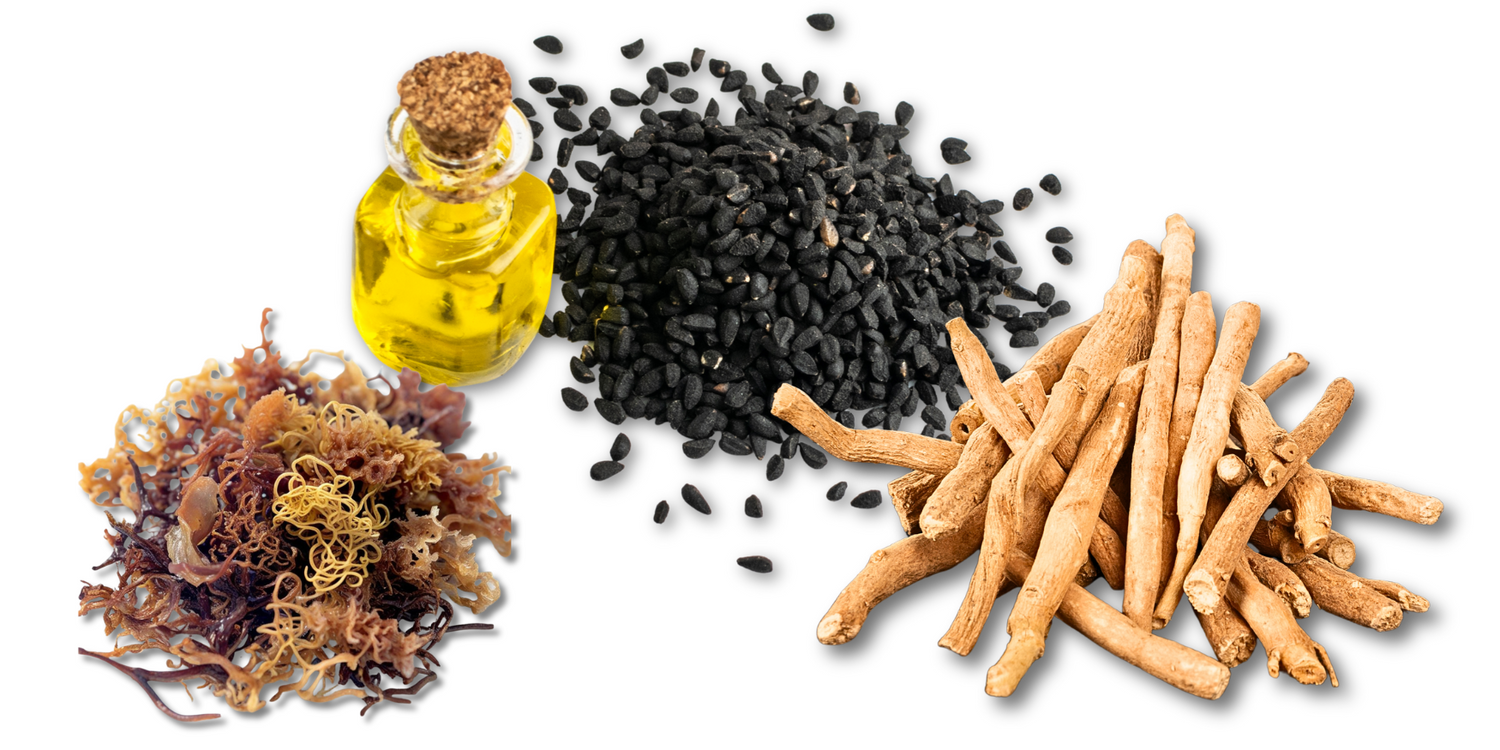 Keep Sea Moss gel refrigerated and use within 2–3 weeks. Black Seed Oil in a cold dry place. Ashwagandha roots in a cool, dry place.