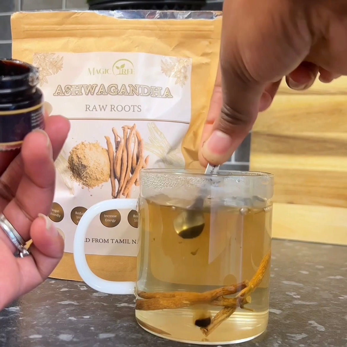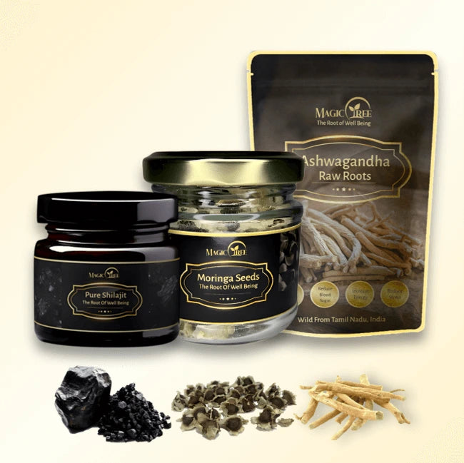 After eating the moringa seeds, brew 4g of ashwagandha roots in a mug of tea. Once the tea has cooled, add a pea size amount of shilajit and stir to dissolve.