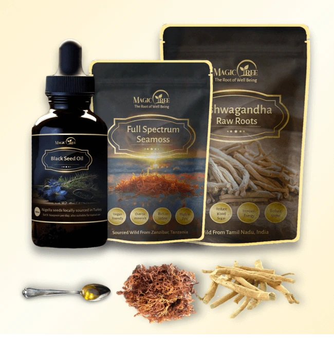 Keep Sea Moss gel refrigerated and use within 2–3 weeks. Black Seed Oil in a cold dry place. Ashwagandha roots in a cool, dry place.